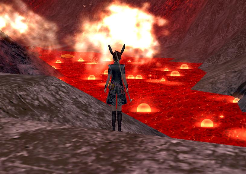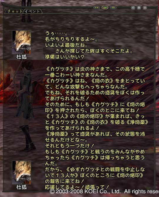 風雷が終わってついに高千穂の頂上の焔の室に着きました。 見た目はこんな感じの風景です。活火山の噴火口って感じですな。とにかく熱そうです。ここはどうやら神々の森みたいに直接カグヅチに会えるようで、河原や風雷の用に雑魚パートはないようです。 オープニングムービーのラストに出てくる巨人ですな。足がないからまるでジオ○グです!(私にも敵が見えるぞ!)手に持っているがどうやら天の逆矛のようです。でも、カグヅチって生まれたときにイザナミの陰部を焼いてしまって、イザナギに切り殺されたはずですが・・・、生きてるんですね。ていうか、神話ネタどこまで続くのかな?最後には高天原に乗り込んだりするのかしら? 狐のセリフからすると残る人以外は一度烙印を受けて、外に出ないといけないみたいです。無敵状態を解除してそれから倒すから、出入りが激しそうですなぁ。弱体アイテムを作るときは13人全員外にいないとだめなのかなぁ?一人ずつ渡せばいいのか?ちょっと調べてみないとわかりません。それにても、仮にも高千穂で最強らしいカグヅチの弱体アイテムを狐が作れるとは・・・。 というわけで焔の室レポートはひとまず終了。東西戦でしばらくチャレンジは遠のきそうですが、撃破してみたいですなぁ。撃破したらまたレポートします!では! |